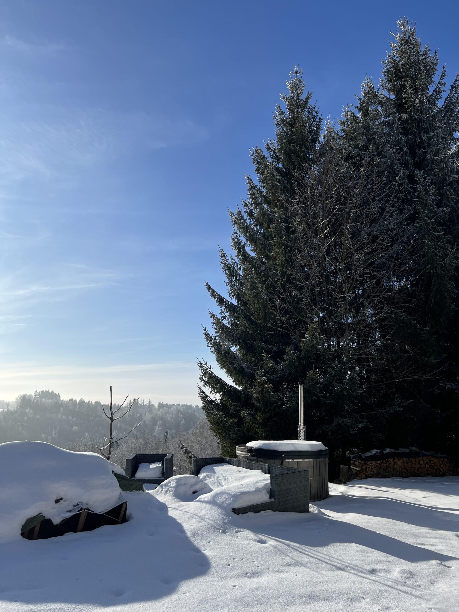 Na terase pod smrky vás čeká vířivý sud, v chatě pak infrasauna a hydromasážní vířivka pro dokonalý oddech.